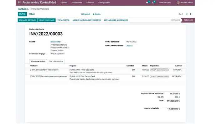 Deja atrás el software complicado. La aplicación de Facturación de Odoo te permite diseñar facturas profesionales personalizadas en minutos. Es la herramienta ideal para una gestión ágil, sin complicaciones y sin coste alguno.